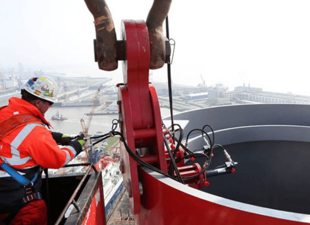 The Aeolus was docked in Bremerhaven at the yard of Lloyd Werft. It was docked at a quay that was relatively narrow. The operation required a crane that was compact enough to fit on the quay, yet powerful enough to perform the heavy lifts and with sufficient reach to handle the 87-meter-long legs.