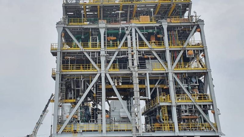 A configuration of six towers of the Mammoet Mega Jack 5200 were used, each with a capacity of 5,200t. Small mobile cranes and forklift trucks were used to assemble this equipment. Once all the jacks were in place, the rig was lifted to a height of 35 meters.