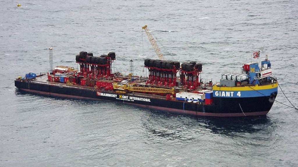 The 130-meter semi-submersible barge was specially adapted for use. A large hole was cut in the hull and large saddles constructed under the barge to transport the precious cargo underneath, with the Kursk’s command tower protruding into the hull.