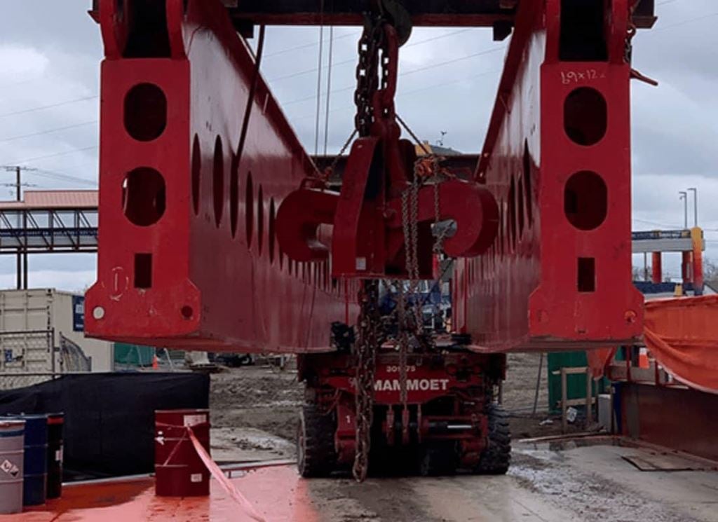 Each girder measured approximately 21m (70 ft.) long and would be set on bearing pads over an existing dirt pit. Mammoet’s team came up with a solution using a unique cantilever setup on top of SPMTs, based on a previous execution.