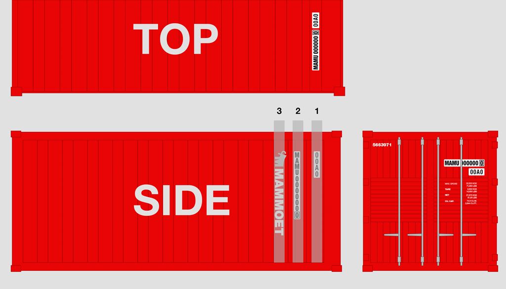 Containers are painted fully in red, with a vertically positioned logo on the right-hand side of the container. Position of the logo is always to the left of the required informational decals, either location 2 or 3. If there are none, the logo is positioned on the far right in position 1. Standard Mammoet logo size is 150mm x 1500mm or 5,9” x 59”, all required templates.