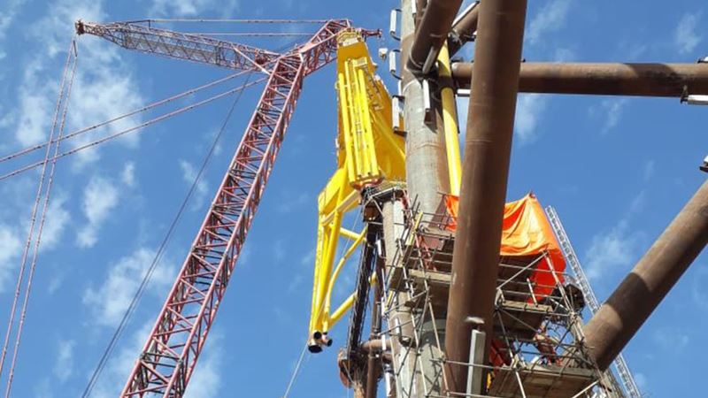 The 83,5m long rotor blades were shipped in from Denmark. The transportation of these enormous blades over land turned out to be a challenging job, but thorough preparation of both all lifting and logistics services guaranteed a safe and smooth operation. With all the components on-site, it took Mammoet’s largest crawler crane, capable of handling up to 1600 tons, and two smaller crawlers to erect SHI’s wind turbine. The 1600-ton crane first installed the jacket foundation and two tower sections.