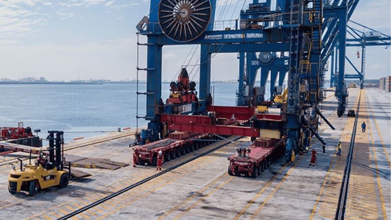 This was done to make sure the barge deck remained level with the quayside as the loaded SPMT trailers maneuvered over the load-out linkspan bridge onto the barge. Once the ferry has been positioned at its proper stowage location, dragline boards were replaced by a plate and hinge angles were cut to allow SPMTs to roll-off the semi-sub barge. Leveling and alignment checks were also done before the ferry was lowered completely. It was then transported approximately 172m from its original position to a stowage location.